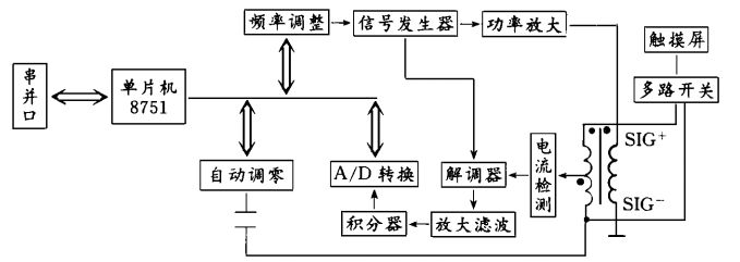 加到觸摸屏的右邊電極上,觸摸屏的上邊和下邊電極全部開路,這樣在觸摸屏的X 方向上建立了交流電壓梯度,經(jīng)解調器解調和濾波后,可得到X 方向上的觸摸電流為iX= KXXV/ Zf ,其中,V為變壓器次級對于中心抽頭虛地的電壓,KX 為常量,V/ Zf 為電路等價阻抗觸摸電流。第2 種模式為將SIG+加到觸摸屏的左邊電極上,同時也加到觸摸屏的右邊電極上,這時在X 方向上建立了均勻的交流電壓。如果在觸摸屏上任意一點進行觸摸,則經(jīng)解調器解調和濾波后,得到其觸摸電流為i ZX= KZXV/ Zf ,其中,KZX為常量。由iX 和iZX得X 方向的觸摸位置坐標為X= (KZX/ KX)·( iX/ i ZX ) ,式中,iX、iZX在以上2 種掃描模式下測得,而常量KZX/ KX 可由實驗確定。一旦確定了KZX / KX,就可計算出X 方向的任意觸摸位置坐標X。同樣,第3 種模式是將SIG+和SIG-分別加到觸摸屏的上邊電極和下邊電極上,即可得到Y方向上的觸摸電流為i Y= KYYV/ Zf ,其中,KY 為常量。第4種模式是同時將SIG+加到觸摸屏的上邊電極和下邊電極上,得等價阻抗觸摸電流為 iZY= KZYV/ Zf ,其中,KZY為常量。也可由 iY 和 iZY得Y 方向的觸摸位置坐標為 Y=(KZY/ KY) ( i Y/ i ZX) ,其中,常量KZY/ KY 同樣可由實驗確定。