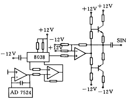 控制器的激勵信號源如圖3 所示。信號由函數(shù)信號發(fā)生器8038 產(chǎn)生,它能夠輸出正弦波和方波,正弦波用作觸摸屏的激勵信號。單片機通過 8 位 D/ A 轉換器可控制8038 的振蕩頻率,一般控制在200 kHz 左右,以避開計算機顯示器掃描信號產(chǎn)生的干擾。同時,由8038 產(chǎn)生的方波信號提供給模擬解調器,作為解調信號參考源。由于8038輸出的正弦波信號功率有限,為此在8038的正弦波信號輸出端增加了功率放大電路。
