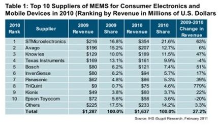 2010年TriQuint在該領(lǐng)域的營(yíng)業(yè)收入劇增778.6%,達(dá)到7470萬(wàn)美元,而2009年只有區(qū)區(qū)850萬(wàn)美元。TriQuint在該市場(chǎng)的排名因而從2009年的第16竄升至第8。意法半導(dǎo)體在10大廠商中的增長(zhǎng)率排名第二,其營(yíng)業(yè)收入大增63.5%,從2009年的2.163億美元上升到3.536億美元,擴(kuò)大了在全球消費(fèi)與移動(dòng)MEMS銷售額方面的領(lǐng)先優(yōu)勢(shì)。