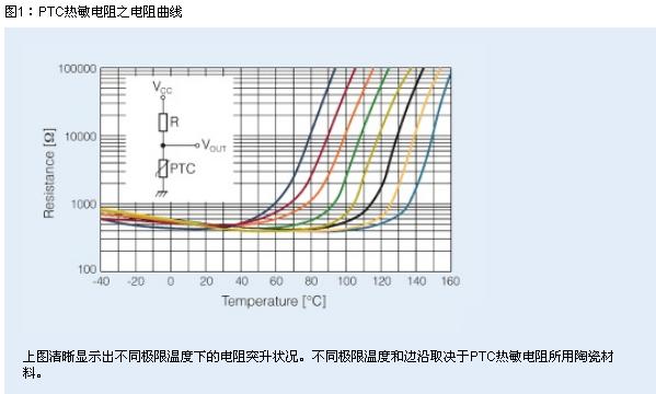 在常溫下,PTC傳感器電阻較低,典型值小于1 k?。然而,隨著溫度的上升,其電阻開始升高。當達到指定極限溫度Tsense時,電阻值為4.7 k?(精確度:±5℃)。如果溫度再上升15 K,PTC電阻將提高10倍,達到47 k?(隨溫升呈指數(shù)式躍升)。電阻突升使PTC熱敏電阻成為極限溫度傳感器的理想選擇,允許其在適當時機檢測敏感電子元件的臨界溫度。為此,溫度傳感器應(yīng)盡量靠近需保護的元件進行安裝,從而確保良好的熱接觸和快速響應(yīng)時間。