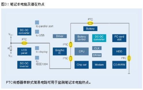 盡管當前POL具有較高效率,但仍會產(chǎn)生熱耗,為避免局部過熱,常需監(jiān)測POL溫度,同樣也需對處理器、圖像卡芯片組、充電電池、光/磁碟機以及RAM和其它系統(tǒng)單元進行溫度監(jiān)測。圖3所示為某筆記本電腦典型配置以及需監(jiān)測的熱點。