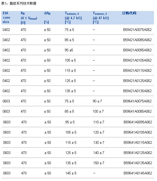 除了配置簡單可靠,該電路還有另一顯著優(yōu)勢:由于超級系列PTC傳感器在75 ~ 145℃范圍均有極限溫度差別是10 K的型號,因此可針對性地使用不同參考溫度監(jiān)測各熱點。表1所述為超級系列產(chǎn)品主要數(shù)據(jù)。
