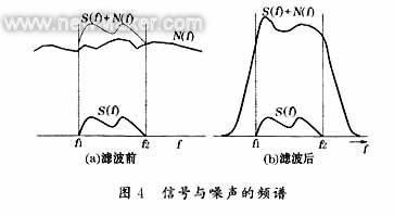 濾波電路的作用主要是對(duì)輸入信號(hào)進(jìn)行處理,通常是希望濾出噪聲。濾波器種類很多,從大的方向可分為經(jīng)典濾波器與現(xiàn)代濾波器兩大類。經(jīng)典濾波器可濾出與有用信號(hào)占用不同頻帶的噪聲,但對(duì)有用信號(hào)與噪聲的頻譜相互重疊的情況卻無(wú)能為力。圖4所示是信號(hào)與噪聲的頻譜,圖4中,S(f)為有用信號(hào),頻帶為f1~f2,N(f)為噪聲,經(jīng)濾波后只能濾出f1~f2以外的噪聲,噪聲與信號(hào)重疊部分無(wú)法濾出。