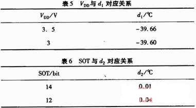 式中,d1和d2為特定系數(shù)。d1的取值與SHT11工作電壓有關,d2的取值則與SHT11內部A/D轉換器采用的分辨率有關,其對應關系分別如表5和表6所示。