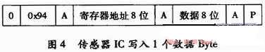 寫數(shù)據格式:圖4所示為向傳感器IC寫入1個字節(jié)數(shù)據時的正確幀格式。