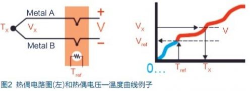 熱電偶是溫度測量中最常用的傳感器。其主要好處是寬溫度范圍和適應(yīng)各種大氣環(huán)境,而且結(jié)實、價低,無需供電,尤其最便宜。熱電偶由在一端連接的兩條不同金屬線(金屬A和金屬B)構(gòu)成,如圖1所示。當(dāng)熱電偶一端受熱時,熱電偶電路中就有電勢差??捎脺y量的電勢差來計算溫度。