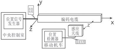 自動(dòng)控制系統(tǒng)中,必須解決兩個(gè)基本問題:a.控制和受控雙方可靠的數(shù)據(jù)通信;b.移動(dòng)機(jī)車所在位置的位置檢測(cè)。感應(yīng)無線位置檢測(cè)系統(tǒng),將感應(yīng)無線數(shù)據(jù)通信和位置檢測(cè)融合在一個(gè)系統(tǒng)中,它由位置信號(hào)發(fā)生器、編碼電纜、感應(yīng)天線、位置檢測(cè)器組成。其中感應(yīng)天線箱安裝在移動(dòng)機(jī)車上隨機(jī)車移動(dòng),且始終與編碼電纜保持距離z;編碼電纜部分由編碼電纜、連接電纜、匹配阻抗構(gòu)成。感應(yīng)無線位置檢測(cè)系統(tǒng)框圖如圖1所示。