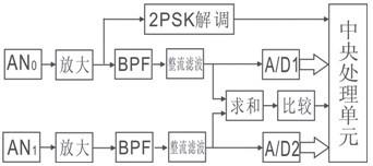 感應(yīng)無線位置檢測(cè)系統(tǒng)電路框圖如圖5所示。當(dāng)中控室地面局開始發(fā)送載波信號(hào)時(shí),DCD=1;CPU檢測(cè)到DCD后,對(duì)2PSK解調(diào)輸出檢測(cè),將第1個(gè)1作為起始位進(jìn)行串行數(shù)據(jù)接收,得到APD位置數(shù)據(jù)g;在檢測(cè)G0的時(shí)間段,啟動(dòng)A/D1和A/D2,從A/D1和A/D2讀出接收線圈0接收的信號(hào)幅度A(AN0)和接收線圈1接收的信號(hào)幅度A(AN1),將各數(shù)據(jù)代入公式(5)~(8),可得移動(dòng)機(jī)車位置ADD。