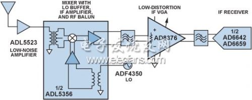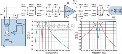 圖3顯示了超外差式接收機的一個通道,該器件采用以下元件:低噪聲放大器ADL5523具有LO緩沖器、IF放大器和RF巴倫的雙通道平衡混頻器 ADL5356;帶通或者低通濾波器;雙通道、超低失真IF VGAAD8376另一個低通或者帶通抗混疊濾波器;雙通道IF接收機AD6642