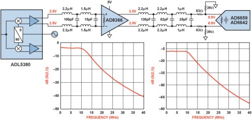 某些應用中,ADL5380可能需要直接連接至AD6642,這種情況下,可為AD6642差分輸入添加500 Ω電阻以改善匹配。ADL5380電壓增益為6.9 dB,且具有與AD8366相同的共模問題。所以應使用160 Ω串聯(lián)電阻和100 Ω并聯(lián)電阻來實現(xiàn)500 Ω負載和所需的共模電壓。同樣,電阻網(wǎng)絡可將電壓增益衰減8 dB(功率則衰減4 dB)。