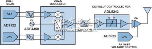 圖5顯示了超外差式或ZIF發(fā)射機,該器件采用以下元件:TxDACAD9122、低通濾波器、正交調(diào)制器ADL537x、另一個RF濾波器、頻率合成器ADF4350、數(shù)字控制VGAADL5243、功率放大器、用于控制功率放大器(PA)柵極電壓的DACAD562x.