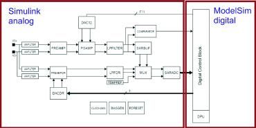 確定磁場之后是傳感器系統(tǒng)仿真。AMR 元件的電阻變化是各向異性磁阻效應的直接結果。這樣,磁場仿真的結果會導致代表信號處理中輸入信號的電阻發(fā)生變化。對模擬前端進行建??刹捎?Simulink。這種行為模型是概念設計的產物,標志著產品開發(fā)的起點。每個 Simulink 塊對應一個模擬信號處理組件,例如放大器或過濾器。但是,尚未考慮模擬組件的控制部分,這由數字系統(tǒng)實現。HDL 設計則仿真通過數字方法實現的功能,而且在完成產品開發(fā)之后就會最終成形。因此,整體系統(tǒng)仿真是 Simulink 對模擬組件的行為模型以及 ModelSim 對 HDL 設計的共同仿真(圖8)。可通過仿真從概念階段順利過渡到 HDL 設計及后續(xù)階段。在共同仿真中,可用 ModelSim 中部署的 Verilog 代碼逐漸代替 Simulink 參考模型,從而可逐項驗證 HDL 設計。可持續(xù)進行此過程,直到在 Verilog 中實現整個數字部件,而模擬系統(tǒng)部件仍保持為 Simulink 模型。此工具組合也已證明對 IC 評估同樣有用。自始至終使用這種工具可以更容易理解 IC 行為,并可創(chuàng)建用來分析和解釋任何錯誤的框架。這些工具的主要好處在于,能夠更快速、更準確地答復客戶的查詢,以及更好地了解與環(huán)境條件相關的傳感器功能。
