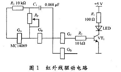 為減少自然光、照明光和其他干擾光的影響,需對(duì)反相器電路產(chǎn)生的脈沖輸出進(jìn)行脈沖調(diào)制,反相器中的GA和GB構(gòu)成振蕩電路,如果反相器GA和GB的門限電平為1/2Ucc(Ucc為MC14069電源電壓),則電路的振蕩頻率f,由電容C1和電位器Rp 的值決定,即f=1/(2.2Rc)。其中,R為Rp的阻值,C為C1 的電容值。
