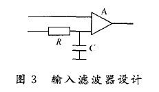 對(duì)于高精度mV 級(jí)的DC放大器,其各種交流干擾都將成為放大器寄生信號(hào)的重要信號(hào)源,因此,必須在運(yùn)算放大器的輸入端加輸入濾波器,通常由一個(gè)大電阻(4.7 kΩ)和一個(gè)小電容(3.3μF)構(gòu)成RC濾波,如圖3所示。