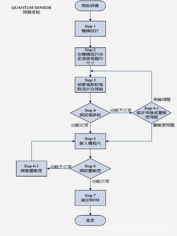 使用電容式感應(yīng)的IC設(shè)計感應(yīng)開關(guān)電路板與其它電路的開發(fā)流程略有不同,因?yàn)殡娙菔介_關(guān)的設(shè)計上會受到機(jī)構(gòu)與其它電路設(shè)計上的影響,會有比較多的調(diào)整程序,所以需要一個比較復(fù)雜的開發(fā)流程,現(xiàn)就以出道較早且具有代表性的“Quantum ”產(chǎn)品的開發(fā)流程及要點(diǎn)介紹給大家,希望對需要的朋友有所幫助。下圖是開發(fā)流程圖: