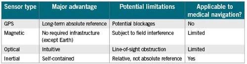 表2 廣泛應(yīng)用的導(dǎo)航傳感器及其對(duì)醫(yī)療導(dǎo)航的適用性