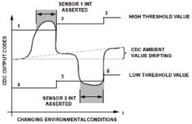 隨著環(huán)境條件的變化(例如,溫度或濕度上升),傳感器的環(huán)境參數(shù)(在用戶沒(méi)有與傳感器接觸期間,由CDC進(jìn)行測(cè)量)會(huì)發(fā)生漂移。為了進(jìn)行補(bǔ)償,需要?jiǎng)討B(tài)改變高端和低端閾值電平,以確定有效的傳感器接觸。位置2、3、5、6處的參考電平進(jìn)行重新調(diào)整,以保持最佳的閾值參考電平,從而自動(dòng)跟蹤和補(bǔ)償漂移誤差。