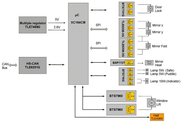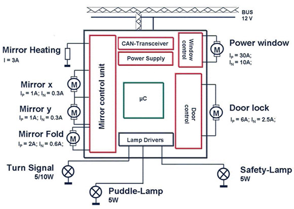 圖5是車門模塊的一個例子,其中用半導(dǎo)體器件驅(qū)動升窗電機,用分立的標(biāo)準(zhǔn)器件驅(qū)動其它小型負(fù)載。