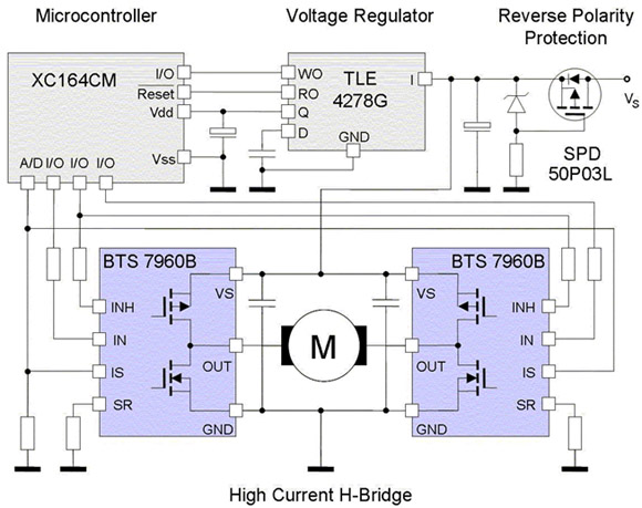 智能開關(guān)和橋的出現(xiàn)為解決以上問題打開了大門。一些新的器件,如英飛凌的NovalithIC,可以為大電流電機驅(qū)動設(shè)計提供合適的解決方案。