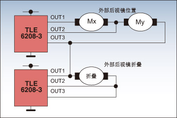圖4: 采用TLE6208-3的后視鏡電機驅(qū)動的例子。
