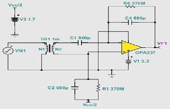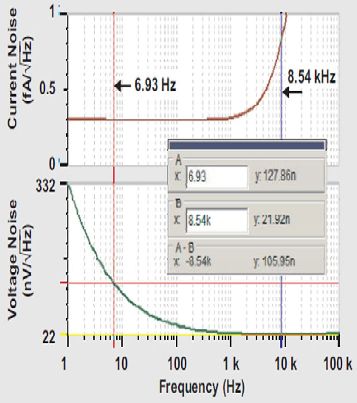為了獲得更為實際的電路實施,我們選用了TI的OPA337.這款放大器擁有低輸入電壓和低輸入電流噪聲(請參見圖5),同時接受3V單極電源。圖6顯示了TI SPICE型仿真程序中這種電路的模型,即TINA-TI.