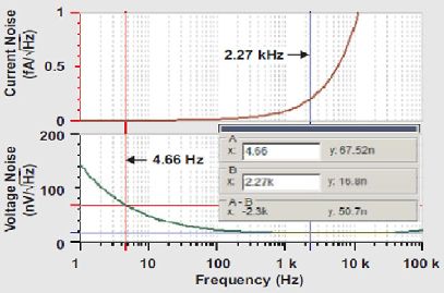 在第一項中,如果INA ≈ 0.01 fA/√HZ ,且RFB =270MΩ,則該項對輸出噪聲的貢獻值約為2.7 nV/ √HZ /5.85=0.5 nV/√HZ .