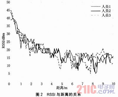 3個(gè)工作人員分別拿著移動(dòng)終端在0~10 m的范圍內(nèi)勻速前進(jìn),得到的RSSI值與距離的關(guān)系如圖2所示。