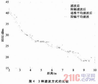 紅外線、GPS和超聲測距都需要額外的硬件,增加了節(jié)點(diǎn)的硬件成本和尺寸。GPS和紅外線測距誤差較大,而利用超聲方法測距很精確,測距誤差只有10 cm,但是受氣溫、濕度等的影響較大,不適合在室外使用?;赗SSI的定位無需額外硬件,利用對接收無線信號的強(qiáng)度判斷,推導(dǎo)收發(fā)節(jié)點(diǎn)間的距離,計(jì)算接收無線信號強(qiáng)度是商用無線收發(fā)芯片具備的功能?;赗SSI的測距提供了最廉價(jià)的定位方法,而且節(jié)點(diǎn)沒有添加任何部件。基于超聲的測距雖然定位精度較高,但是需要添加硬件、增加節(jié)點(diǎn)成本和尺寸。所以,基于RSSI的測距是無線傳感器網(wǎng)絡(luò)定位較常采用的方法。首先對RSSI進(jìn)行預(yù)處理,再通過預(yù)測模型預(yù)測距離的值,不但提高了基于RSSI的測距精度,而且實(shí)現(xiàn)了低成本的測距。