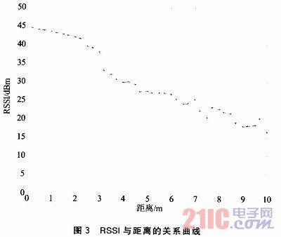在相同的實(shí)驗(yàn)平臺下,在0~10 m的范圍內(nèi),每間隔0.2 m或者0.3 m記錄RSSI值,每個(gè)距離均接收100個(gè)左右的數(shù)據(jù)包,對RSSI先進(jìn)行均值處理,然后得出RSSI值與距離的關(guān)系曲線如圖3所示。