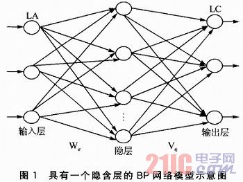 BP網(wǎng)絡(luò)是神經(jīng)網(wǎng)絡(luò)中采用誤差反傳算法作為其學(xué)習(xí)算法的前饋網(wǎng)絡(luò),通常由輸入層、輸出層和隱含層(一層或多層)構(gòu)成。層與層之間的神經(jīng)元采用全互連的連接方式,通過相應(yīng)的網(wǎng)絡(luò)權(quán)系數(shù)w相互聯(lián)系,每層內(nèi)的神經(jīng)元之間沒有連接。圖1所示為具有一個(gè)隱含層的BP網(wǎng)絡(luò)模型。其中:LA為BP神經(jīng)網(wǎng)絡(luò)的輸入層,LB為隱層,LC為輸出層,Wir為隱層與輸入層的權(quán)值,Vrj為輸出層與隱層的權(quán)值。