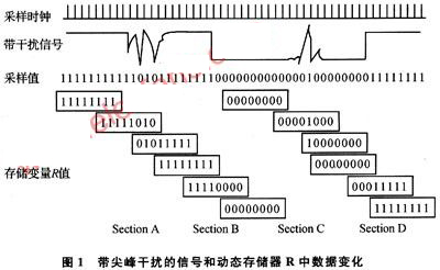 從單片機(jī)計(jì)數(shù)輸入端,觀察信號(hào)波形。為便于分析,在高、低電平段設(shè)置了幾個(gè)干擾尖峰脈沖,分別標(biāo)示為Section A和Section C,占空比信號(hào)下降沿、上升沿分別標(biāo)示為Section B和Section D。單片機(jī)按計(jì)數(shù)時(shí)鐘周期性采樣,采樣值中“1”表示采到的是高電平,“0”表示低電平。I/O口采樣占空比信號(hào)輸出端口中狀態(tài),利用1個(gè)字節(jié)型變量R來(lái)動(dòng)態(tài)存儲(chǔ)采樣值??刂破髅坎蓸?次,變量R中數(shù)據(jù)向左移1個(gè)二進(jìn)制位,R原最高位電平狀態(tài)被移除,而當(dāng)前時(shí)刻新的采樣狀態(tài)保存到R的最低位,變量R被更新了,狀態(tài)存儲(chǔ)器R中保存著最近8個(gè)采樣周期的采樣值。