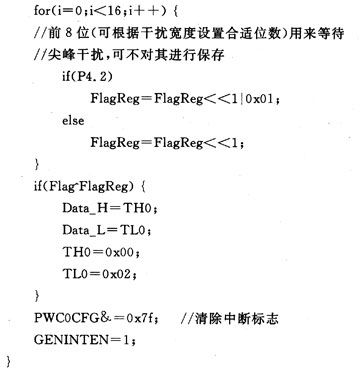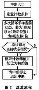根據(jù)軟件濾波設(shè)計(jì)思想,濾波子程序由主程序在信號(hào)狀態(tài)發(fā)生變化,進(jìn)入中斷時(shí)調(diào)用,圖2給出了濾波程序流程。對(duì)照?qǐng)D1中4種Section來(lái)分析流程圖。當(dāng)有邊沿或干擾信號(hào)(信號(hào)周期大于計(jì)數(shù)時(shí)鐘周期)到來(lái)時(shí),VRS51L3074單片機(jī)的PWC計(jì)數(shù)停止條件滿足,系統(tǒng)進(jìn)入中斷服務(wù)子程序。在中斷子程序中,首先重置脈寬計(jì)數(shù)條件,然后對(duì)當(dāng)前狀態(tài)進(jìn)行采樣,采樣1次,狀態(tài)寄存器左移1位,采樣到高電平記為“1”,采樣到低電平記為“0”。如正常下降沿Section B,前面處于高電平段,初始狀態(tài)變量Flag全為1,當(dāng)出現(xiàn)低電平,控制器進(jìn)人中斷,緊接著進(jìn)行16次采樣。前已提及系統(tǒng)處理的尖峰干擾約1~2 ms,每個(gè)采樣周期約為0.4 ms,其尖峰干擾脈寬達(dá)不到8個(gè)采樣周期。系統(tǒng)設(shè)計(jì)時(shí)采樣16次,只取最后8次的存儲(chǔ)狀態(tài)與原狀態(tài)進(jìn)行比較,如果最后采樣的狀態(tài)全為“0”則與原狀態(tài)相反,就可判斷出這是1個(gè)正常下降沿。如果是干擾信號(hào)引起計(jì)數(shù)中斷,前面8個(gè)采樣狀態(tài)不全為“1”,后面8個(gè)狀態(tài)全為“1”,最后采樣的狀態(tài)與原狀態(tài)相同,就可判斷出這是1個(gè)干擾信號(hào),如Section A。在信號(hào)狀態(tài)采樣期間,計(jì)數(shù)條件滿足PWC繼續(xù)計(jì)數(shù),直到真正的下降沿到來(lái),計(jì)數(shù)停止并保存,計(jì)數(shù)寄存器還原為初始值,這樣干擾信號(hào)即被濾除。類(lèi)似地,正常上升沿Section D,存儲(chǔ)器原狀態(tài)為“0”,上升沿來(lái)臨后存儲(chǔ)器狀態(tài)為“1”,與原狀態(tài)相反,PWC計(jì)數(shù)停止并保存,計(jì)數(shù)寄存器還原為初始值,退出中斷子程序。有干擾信號(hào)出現(xiàn)后采樣狀態(tài)與原狀態(tài)相同,干擾尖峰脈沖可被濾除。如果要使脈寬計(jì)數(shù)更精確,可判斷前8個(gè)采樣周期中系統(tǒng)不正常計(jì)數(shù)的周期,然后與最終計(jì)數(shù)周期相加即可。此時(shí),程序流程體現(xiàn)出軟件濾波功能。