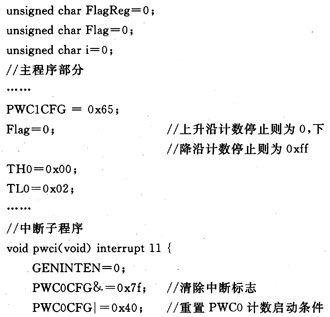 VRS51L3074單片機(jī)是由美國(guó)Ramtron(瑞創(chuàng))公司推出的8位單片機(jī)家族VRS51L3XXX系列的成員。VRSS1L3074提供了2個(gè)與定時(shí)器0和1關(guān)連的獨(dú)立的脈寬計(jì)數(shù)器(PWC)模塊,用戶可通過(guò)對(duì)PWC模塊和定時(shí)器的配置,靈活地控制定時(shí)器啟動(dòng)或停止計(jì)數(shù),從而方便地實(shí)現(xiàn)對(duì)ADXL202E輸出的脈寬和周期的計(jì)數(shù)。