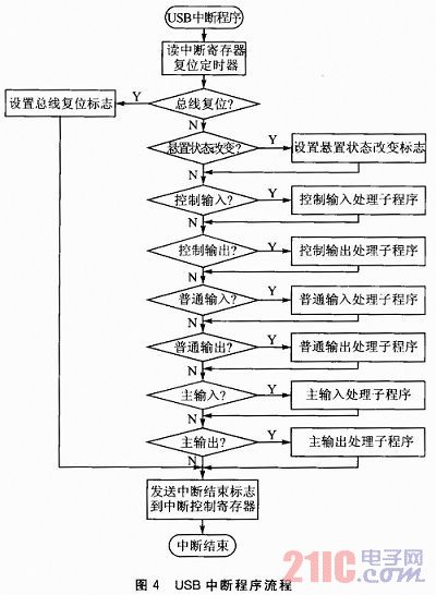 因?yàn)镃8051F321的USB模塊高度集成化,所以對USB接口的設(shè)計主要是USB固件程序的設(shè)計。其中最重要的是USB描述符和USB傳輸中斷的處理。當(dāng)USB中斷到達(dá)時,C8051F321首先讀取3個中斷寄存器(CMINT、IN1INT和OUT1INT)來判斷中斷來源(USB復(fù)位中斷、端點(diǎn)0中斷、端點(diǎn)1輸入中斷、端點(diǎn)2輸出中斷),然后跳入相應(yīng)的處理模塊進(jìn)行處理。USB中斷程序流程如圖4所示。