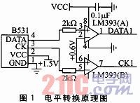 由于容柵傳感器內(nèi)部的專用控制芯片輸出的信號電壓為1.5 V,而后續(xù)數(shù)據(jù)采集系統(tǒng)工作電壓為5 V,要進(jìn)行數(shù)據(jù)交換則必須進(jìn)行電平轉(zhuǎn)換,電平轉(zhuǎn)換原理圖如圖1所示。電路中采用LM393芯片轉(zhuǎn)換電壓,LM393芯片實(shí)質(zhì)上為2個比較器,比較電壓為容柵傳感器工作電壓的一半左右,設(shè)為0.6V。通過比較電壓0.6V與CK和DATA信號線電平比較,即可將CK、DATA信號線的電壓轉(zhuǎn)換為0V或者5V。