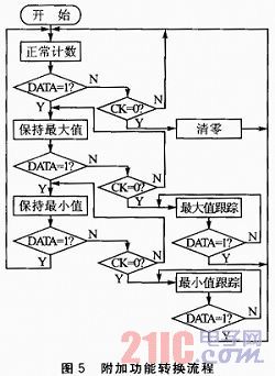 附加功能子程序包括正常計數(shù)、數(shù)據(jù)保持、最大值跟蹤、最小值跟蹤和清零的功能。對附加功能的實(shí)現(xiàn)均是通過控制CK和DATA信號線完成,附加功能轉(zhuǎn)換流程如圖5所示。給CK信號線一個負(fù)脈沖,即可完成清零操作;在正常計數(shù)狀態(tài)下將DATA信號線置為高電平,容柵傳感器將進(jìn)入保數(shù)功能;如果再將CK信號線置為低電平,容柵傳感器進(jìn)入最大值跟蹤功能;內(nèi)部專用芯片將用新測得的數(shù)據(jù)與上一個數(shù)據(jù)進(jìn)行比較,如果新測得數(shù)據(jù)大,則替換掉,否則丟棄??梢栽谏衔粰C(jī)上通過USB測試軟件發(fā)送相關(guān)命令來控制系統(tǒng)進(jìn)行操作。程序中設(shè)定一個字節(jié)的變量來存放從上位機(jī)接收到的命令,當(dāng)判斷是其中的一個命令時就調(diào)用相應(yīng)的處理程序完成操作。