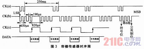 容柵傳感器時序圖如圖3所示。其中包含3個CK信號說明和1個DATA信號說明。CK(a)表示要發(fā)送的完整數(shù)據(jù)間的時序關(guān)系;CK(b)表示一個完整數(shù)據(jù)內(nèi)部各個數(shù)據(jù)組的時序關(guān)系;CK(c)和DATA表示一個數(shù)據(jù)組內(nèi)的時序關(guān)系和對采樣點(diǎn)的說明。由圖可知數(shù)據(jù)每隔250 ms發(fā)送一次,在時鐘CK的上升沿數(shù)據(jù)有效。數(shù)據(jù)由LSB到MSB依次發(fā)送,總共24位二進(jìn)制數(shù)據(jù),分成6組,每組數(shù)據(jù)間隔820μs。其中前5組為數(shù)據(jù)位,第6組為控制位組(包含符號位和公英制位),控制位組的第0位的“0”表示正數(shù),“1”表示負(fù)數(shù),第3位“0”表示公制單位mm,最小單位0.01 mm,“1”表示英制單位inch,最小單位0.000 5 inch,x表示無效。為了能夠?qū)崟r采集數(shù)據(jù),采用中斷方式檢測CK信號,邊沿觸發(fā)。檢測CK信號的高電平持續(xù)超過820μs時,當(dāng)出現(xiàn)下降沿時觸發(fā)中斷,進(jìn)入中斷程序,再持續(xù)檢測低電平直到出現(xiàn)上升沿,讀取DATA信號電平并存儲,總共采集24位。返回主函數(shù)根據(jù)符號位和公英制位進(jìn)行相應(yīng)處理。相關(guān)程序代碼如下: