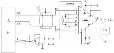 圖1是INA115在心電檢測電路中的實(shí)用電路。放大器的正負(fù)輸入通過心電傳感器分別接到人體的左臂(LA)與右臂(RA)上,與運(yùn)放N和電阻R1~R4組成的驅(qū)動網(wǎng)絡(luò)接到人體的右腿(RL)上,構(gòu)成“浮地”。由于生物信號很弱,加之有極化電位,所以該級的放大倍數(shù)不宜太高,一般取在10~100之間,并且只能作為前置放大用,為了檢測安全,后級一般應(yīng)再采用隔離放大電路進(jìn)行隔離,且該級的電源電壓最好應(yīng)采用隔離電源模塊進(jìn)行提供,以達(dá)到電源及信號的完全隔離。如圖2所示,