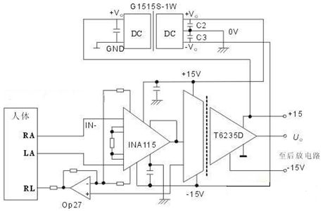 以上電路是由漢為公司的T6235D與INA 115等組成的隔離型心電檢測前置放大電路,該電路由于其具有輸入阻抗高、漏電流小、檢測精度高和滿足人體安全等指標(biāo)完全可以達(dá)到醫(yī)療器械使用的要求標(biāo)準(zhǔn)。該電路一般作為前置放大電路,器件直接與人體接觸,并拾取心電信號后通過INA115進(jìn)行放大,最后由ISO122隔離傳輸?shù)胶笾梅糯箅娐?,?shí)現(xiàn)人體信號與輸出及電源的隔離放大。
