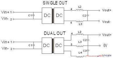 3、 由于DC/DC電源模塊是采用開關(guān)振蕩電路來實(shí)現(xiàn)的,其自身也會產(chǎn)生共模、差模噪聲的干擾,對于對紋波噪聲要求較高的場合可在DC/DC電源模塊的輸出端外接無源LC濾波網(wǎng)絡(luò)或RC(損耗較大),以進(jìn)一步降低電源紋波噪聲,但是要注意L自身諧振頻率要遠(yuǎn)高于模塊的開關(guān)頻率,允許通過的電流值最好在模塊輸入電流的兩倍以上,內(nèi)阻要小,以降低直流損耗。具體可參考下圖: