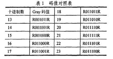編碼采用格雷碼(Gray)為數值碼,以某一固定碼寬為參考碼R,它用于標尺定位和提高精度。Gray碼是一種絕對編碼方式的無權碼,它所具有的循環(huán)、單步特性能消除隨機取數時出現重大誤差的可能,其任意兩個柏鄰整數之間轉換時,只有一個位數發(fā)生變化,大大減少了由一個狀態(tài)轉到下一個狀態(tài)時的邏輯混淆,具有較強的容錯能力。以6位編碼為例,其部分十進制數與Gray碼的一一對應關系如表1所示。
