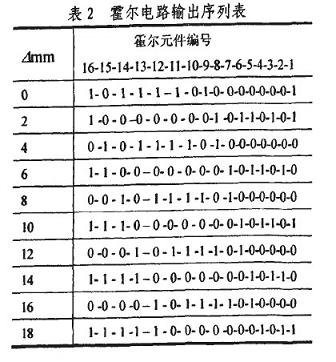 霍爾電路的工作原理是,在外磁場的作用下,當磁感應強度B超過導通工作點時,霍爾電路輸出管導通,輸出低電-半:若曰值低于釋放點時,輸出管截止,輸出高電半。因此在“凸槽”時鋼質活塞桿被磁化,磁感應強度曰增加,霍爾電路導通,輸出低電平,用“1”表示;在“凹槽”時輸出高電平,用“0”表示。以第1個霍爾元件為測量基準,從圖2所示時刻起,位移暈旃次變化b=2mm時,一個碼區(qū)行程內霍爾電路輸出的二進制序列如表2所示。分析可知,序列的標識碼為l 0000000 1,其前面或后面6位序列數分別為相鄰的兩個數值碼,這使它具有很強的容錯能力。標識碼每隔一個霍爾元件間距N在低位部分右移一位。值得注意的是,標識碼前面的數值碼代表磁性標尺當前檢測位置下一個碼區(qū)的值。