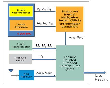 當天線沒有被遮擋時,現(xiàn)代的GPS接收器的絕對定位精度是3米到20米,這個參數(shù)不會在一段時期后發(fā)生漂移?;贛EMS傳感器的捷聯(lián)式慣性導航系統(tǒng)(SINS) 可在很短的時間內(nèi)提供精確的定位信息,但是,根據(jù)運動傳感器的性能,這種導航系統(tǒng)在使用一段時間后很快就會發(fā)生精度漂移現(xiàn)象。行人航位推算系統(tǒng)(PDR)是一個根據(jù)步長和方位計算從室內(nèi)已知初始位置開始的行走距離的相對導航系統(tǒng),雖然定位精度不會隨時間推移而發(fā)生漂移,但是需要在受磁力干擾的環(huán)境內(nèi)保持航向精度,此外,GPS需要對步長進行校準,才能達到可以接受的定位精度。