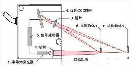 激光發(fā)射器通過鏡頭將可見紅色激光射向物體表面,經物體反射的激光通過接受器鏡頭,被內部的CCD線性相機接受,根據不同的距離,CCD線性相機可以在不同的角度下“看見”這個光點。根據這個角度即知的激光和相機之間的距離,數字信號處理器就能計算出傳感器和被測物之間的距離。