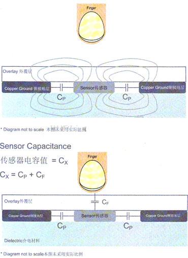 那么,電容式感應(yīng)的工作原埋是什么呢?下面的示意圖顯示了1個(gè)電容式感應(yīng)按鈕的橫截面。如圖所示,在外覆層材料之下,存在導(dǎo)電的銅塊區(qū)域和導(dǎo)電的傳感器。在2個(gè)導(dǎo)電元件相互之間靠得很近時(shí),就會(huì)產(chǎn)生一個(gè)電容值,本圖中標(biāo)為Cp,這個(gè)電容值是由于傳感器墊板與接地板之間的耦合現(xiàn)象而形成的。Cp屬于寄生電容,典型數(shù)量級(jí)任10pF至300pF。傳感器與接地板靠近時(shí)也會(huì)形成一個(gè)邊緣電場(chǎng),這個(gè)電場(chǎng)能夠穿透外覆層?;旧?,人體組織也屬于導(dǎo)電體。將一根手指放存邊緣電場(chǎng)附近時(shí),就會(huì)增加這個(gè)電容系統(tǒng)的導(dǎo)電表面面積。