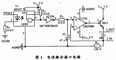 數(shù)據(jù)處理單元具備一路可控4~20 mA的電流輸出,用于現(xiàn)場指示儀表的驅(qū)動。具體的連接電路如圖4所示。其中PWM2連接ARM的PWM2引腳,PWM信號用于控制光耦的導(dǎo)通與截止,反相器主要用于波形的整定,根據(jù)磁敏角度和位移關(guān)系,建立數(shù)學(xué)模型,計算出PWM的占空比,從而達到電流大小調(diào)節(jié)的目的。