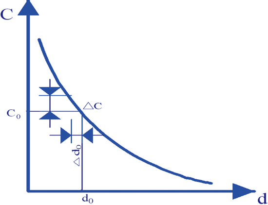 單電容傳感器的一個(gè)極板固定,稱為靜極板,另一極板與被測物體連接為動(dòng)極板。差分電容傳感器的上下極板均固定,稱為靜極板,中間極板為動(dòng)極板。當(dāng)被測物體移動(dòng)時(shí)動(dòng)極板跟隨移動(dòng),就改變了極板間的電容量C,可知C-d特性是一條曲線: