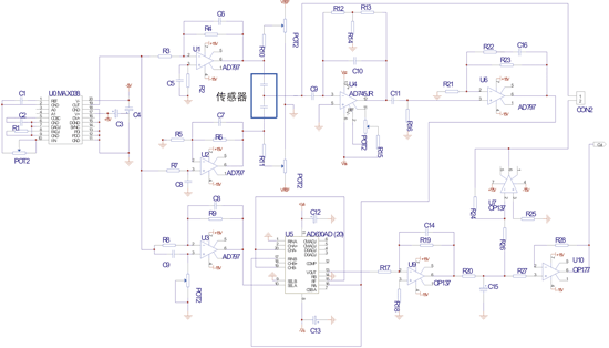 具體電路如圖7所示:U0(MAX038)信號(hào)發(fā)生器芯片產(chǎn)生1MHz的正弦交流信號(hào);U1(AD797)運(yùn)算放大器組成反相比例放大器,U2(AD797)運(yùn)算放大器組成同相比例放大器。1MHz的交流信號(hào)經(jīng)U1、U2后,變?yōu)榇笮∠嗟?、方向相反、相位相?80o的二個(gè)交流激勵(lì)信號(hào),用來激勵(lì)差分電容傳感器;U4(AD745JR)是高輸入阻抗電荷轉(zhuǎn)移放大器。U4是調(diào)理電路的中心,在外加激勵(lì)信號(hào)的作用下,傳感器振動(dòng)引起的電荷轉(zhuǎn)移成電壓信號(hào)的變化。R12、R13、R14采用T型連結(jié),目的是提升電路阻抗和電路系統(tǒng)放大倍數(shù)。U6(AD797)運(yùn)算放大器是 將C11、R16組成的高通濾波器去除低頻干擾后的電壓信號(hào)經(jīng)適當(dāng)放大,為下一步同步解調(diào)作好準(zhǔn)備;U3(AD797)運(yùn)算放大器組成的移相電路,其作用是使調(diào)制信號(hào)和解調(diào)信號(hào)同步;U5同步解調(diào)器,采用ADI公司生產(chǎn)的平衡解調(diào)器AD630,經(jīng)U5同步解調(diào)出的電壓信號(hào)就是反應(yīng)振動(dòng)加速度大小的信號(hào);U9(OP137)運(yùn)算放大器組成二階有源低通濾波器,濾除信號(hào)中高頻噪音成份;U10(OP177)運(yùn)算放大器組成 跟隨器,信號(hào)經(jīng)調(diào)整后跟隨輸出。