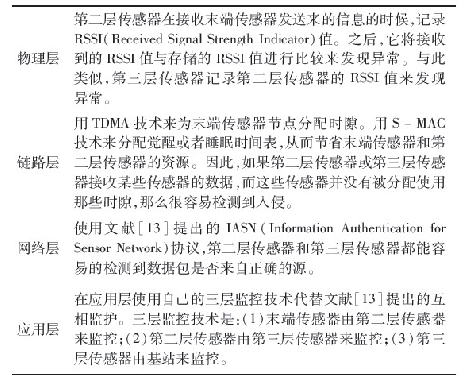 修改了Da Silva等人提出的入侵檢測算法,并將它運用在第二和第三層傳感器上。由于傳感器資源有限,沒有在任何末端傳感器上運用IDS.監(jiān)控節(jié)點的功能被分成三個階段。第一階段:所有的末端傳感器從它們周圍環(huán)境收集數(shù)據(jù),然后報告給第二層傳感器。第二階段:用基于分層的攻擊檢測方法來檢測文獻提出的攻擊類型。表2描述了攻擊在各層中如何被發(fā)現(xiàn)的。這種基于分層的攻擊檢測方法使得系統(tǒng)更完善。第三階段:比較每個上報的結(jié)果來定義閾值,以此來決定是否要發(fā)出一個報警。第三階段常常可以減少錯報率。閾值可以人工定義或者根據(jù)特定的WSN需求來調(diào)整。因此,提出的入侵檢測體系結(jié)構(gòu)通過減少錯報能夠檢測到大多數(shù)的安全威脅。