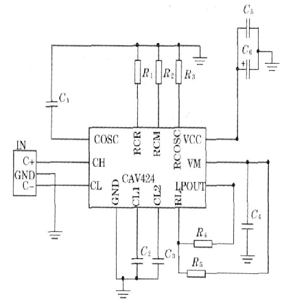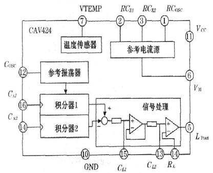CAV424是專門用于電容檢測(cè)轉(zhuǎn)換的集成芯片, 其工作原理圖及外圍連接圖如圖1所示。